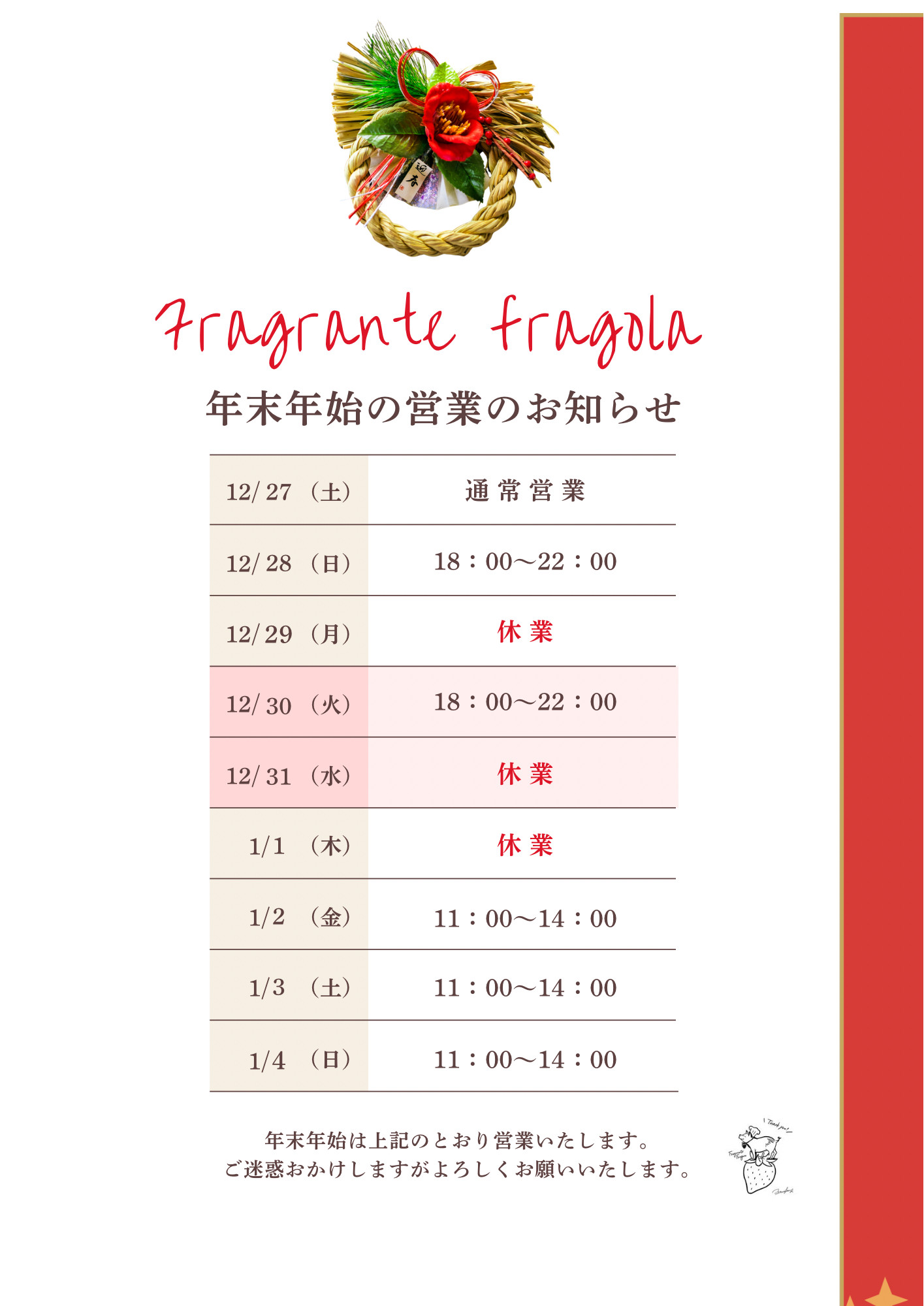 年末年始年始の営業案内です。