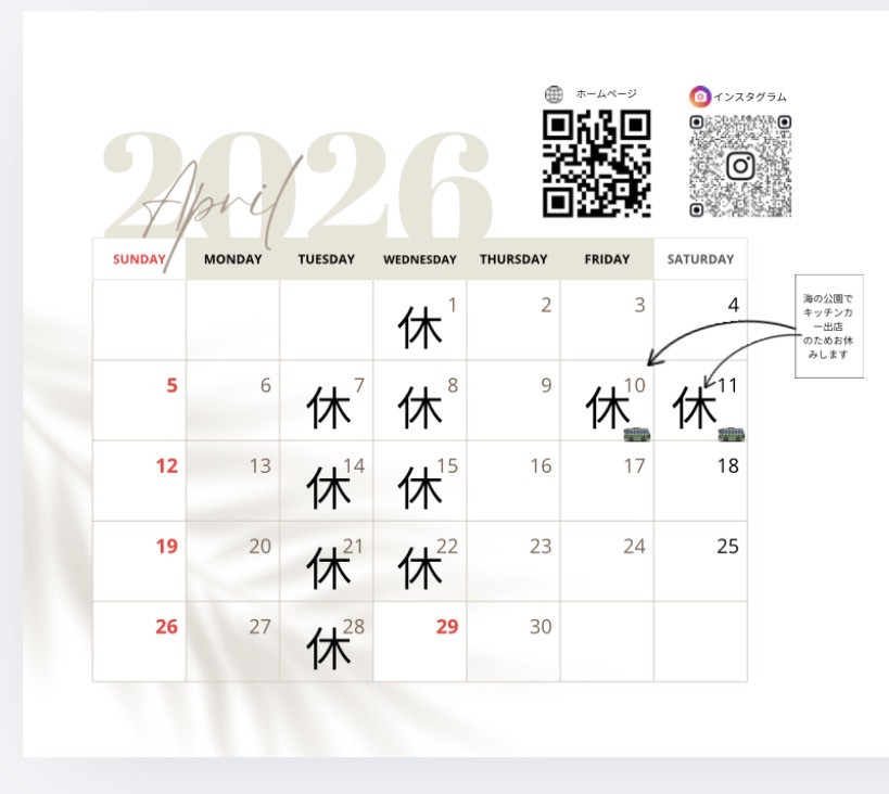 10.11日は、海の公園で、キッチンカー出店のためおやすみです。